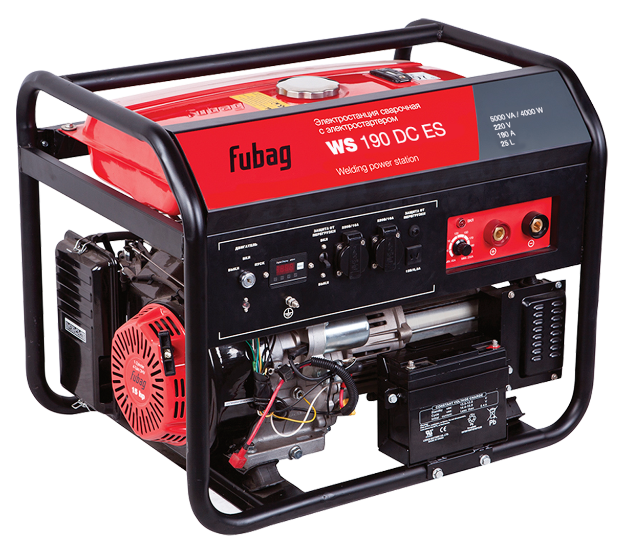 Универсальная сварочная электростанция постоянного тока, оснащенная профессиональным OHV двигателем FUBAG, с электростартером. Увеличенный топливный бак 25л, рассчитан на 10,5 часов непрерывной работы.