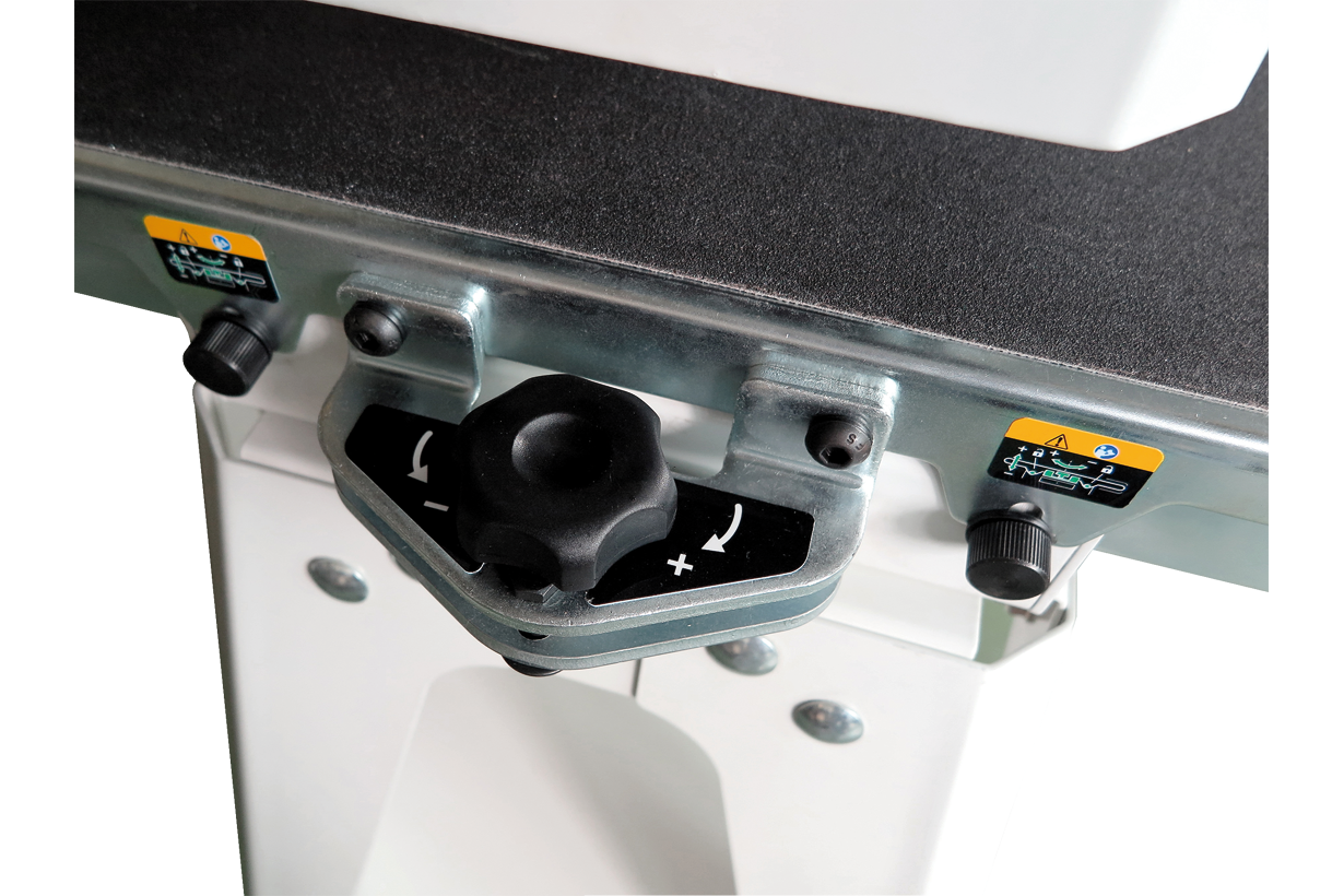 Высота над лентой транспортера регулируется вращением рукоятки, при этом можно контролировать как абсолютное значение по миллиметровой шкале на корпусе, так и относительное перемещение по лимбу на рукоятке. Регулировка параллельности вала и основания производится без вспомогательного инструмента: два фиксатора и винтовой упор оборудованы барашковыми рукоятками.